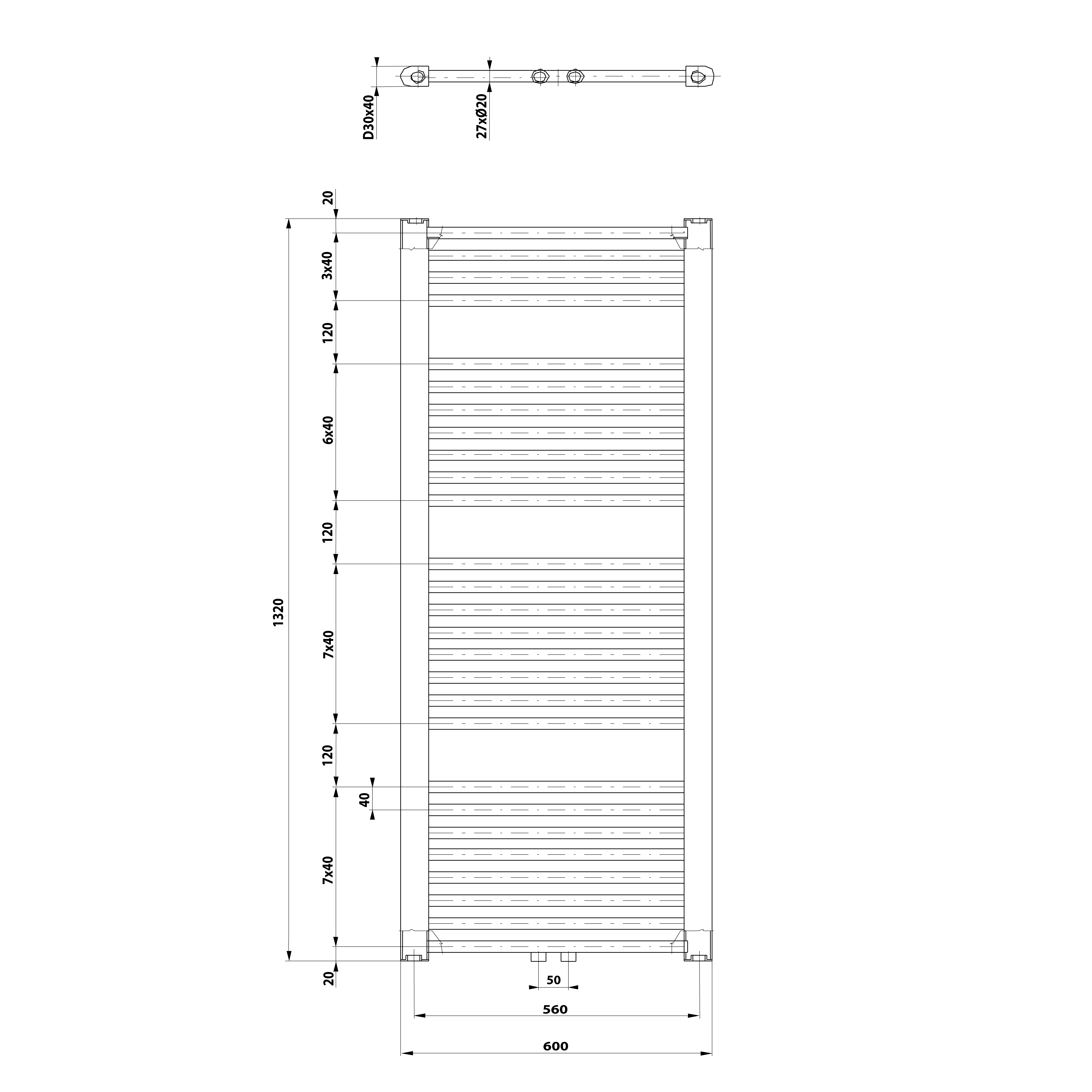 Tradičně tvarované otopné těleso z ocelových trubek v bílém provedení s rovnými vodorovnými profily, středové připojení s roztečí 50 mm.