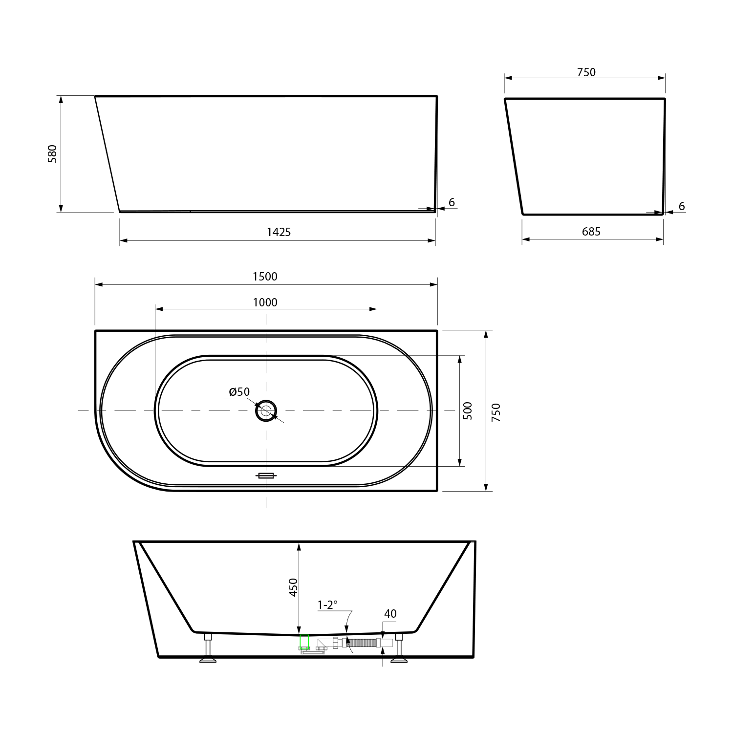 Aqualine TIBERA R rohová stojící vana, 150x75cm, bílá E1037