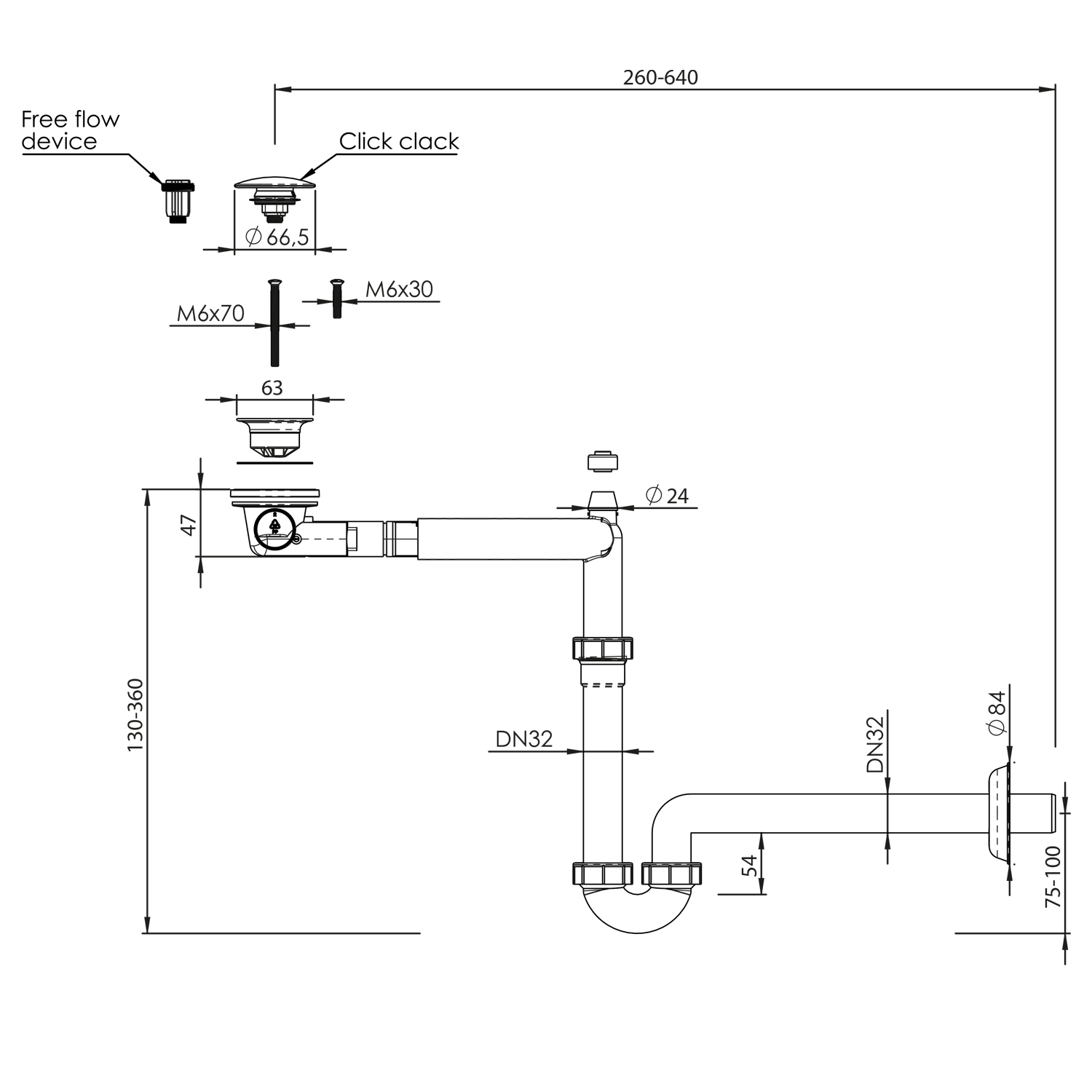 Součástí sifonu je umyvadlová výpust s možností instalace jako uzavíratelná nebo neuzavíratelná click-clack s velkou zátkou pro tloušťku umyvadla 4-65 mm.
