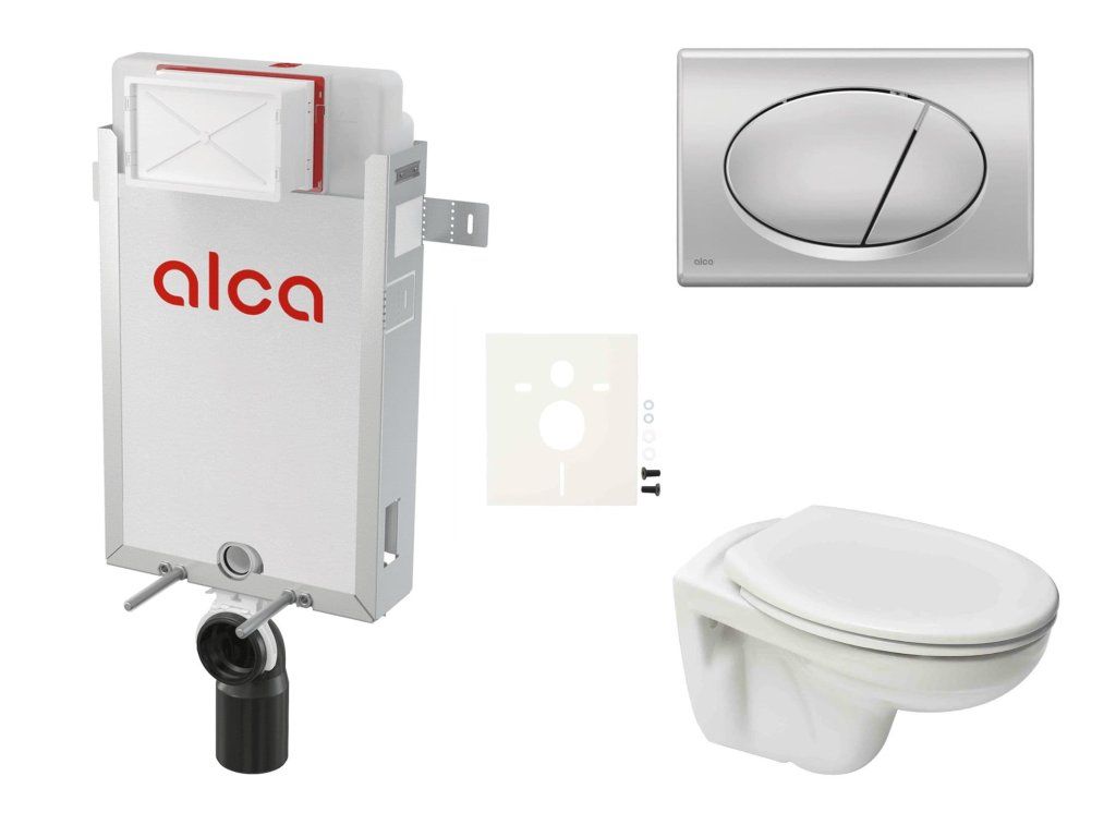 Závěsný WC set - sada obsahuje modul k zazdění, WC nádržku Alca a WC sedátko. WC prkénko je vyrobeno z materiálu Duroplast. Ovládací tlačítko je z materiálu plast a je v barevném provedení chrom matný.Doplňkové parametry