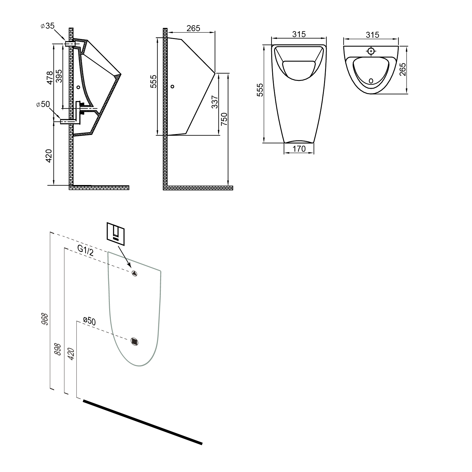 Pro skryté propojení přívodu k urinálu doporučujeme použít propojovací trubičku průměr 12mm, kompatibilní do manžety pisoáru a se závitem ½″ k nástěnce.