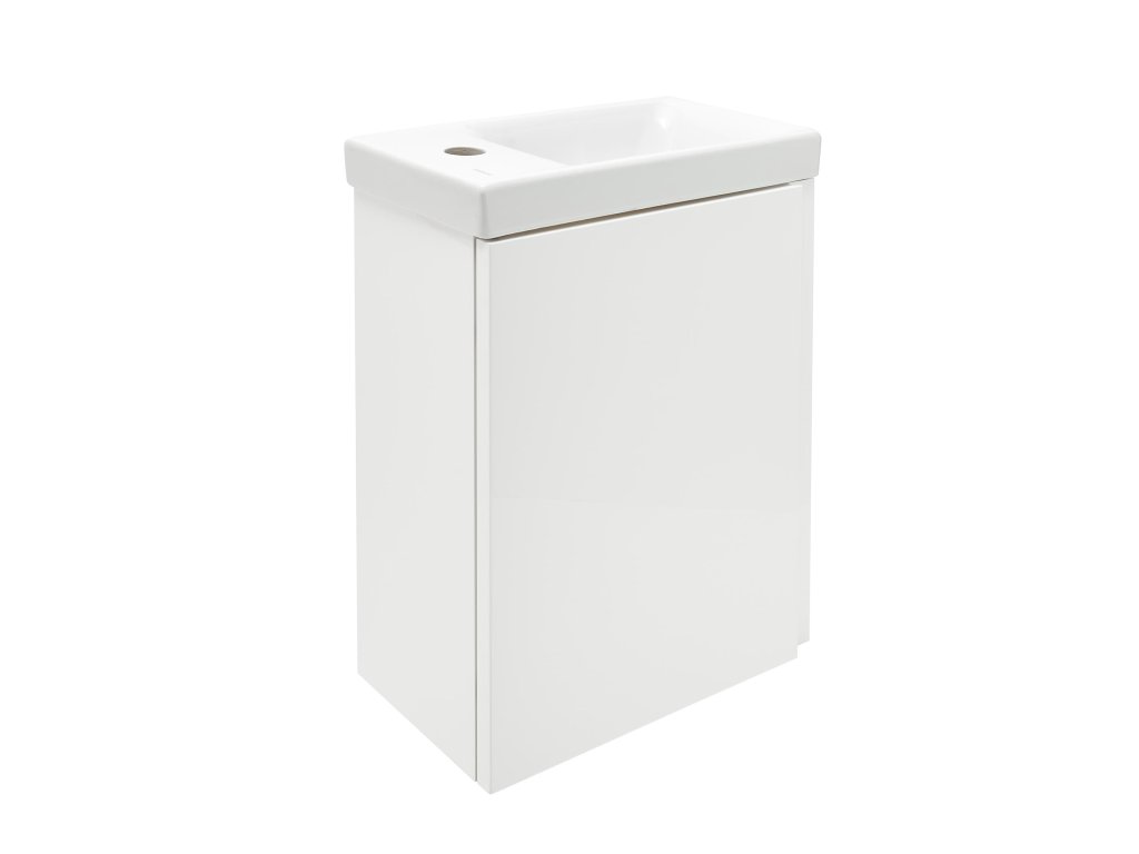 Závěsná koupelnová skříňka s keramickým umyvadlem v bílé barvě s lesklým povrchem o rozměru 40x21,5x64 cm s fóliovaným povrchem S pomalým zavíráním.Doplňkové parametry