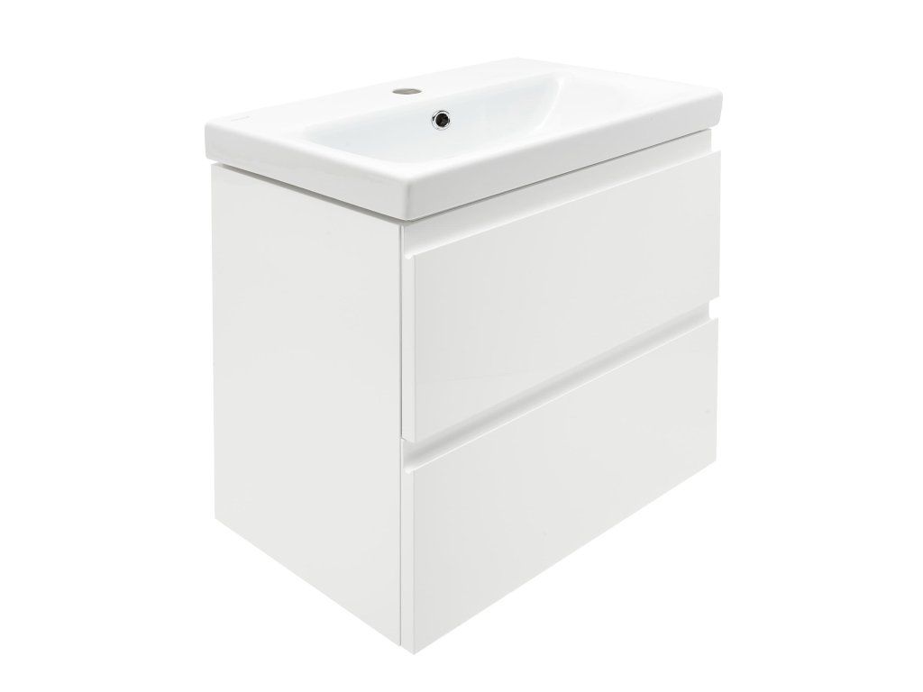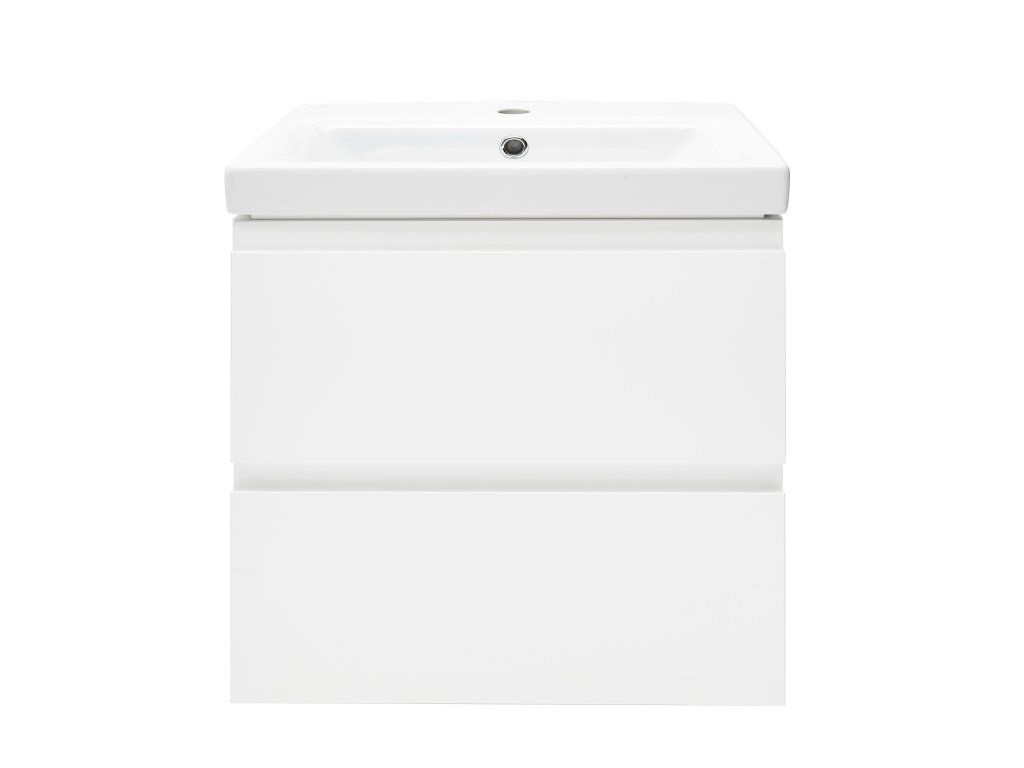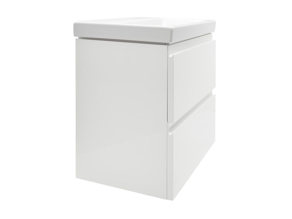 Závěsná koupelnová skříňka s keramickým umyvadlem v bílé barvě s lesklým povrchem o rozměru 50x34,5x63 cm s fóliovaným povrchem S plnovýsuvem a dotahem.Doplňkové parametry
