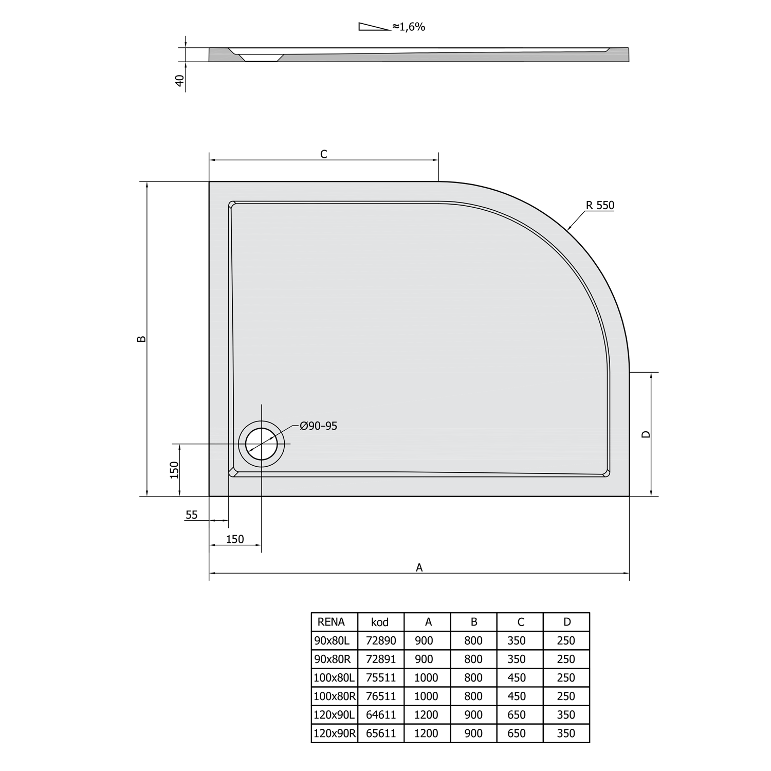 Polysan RENA R sprchová vanička z litého mramoru, čtvrtkruh 90x80cm, R550, pravá, bílá 72891