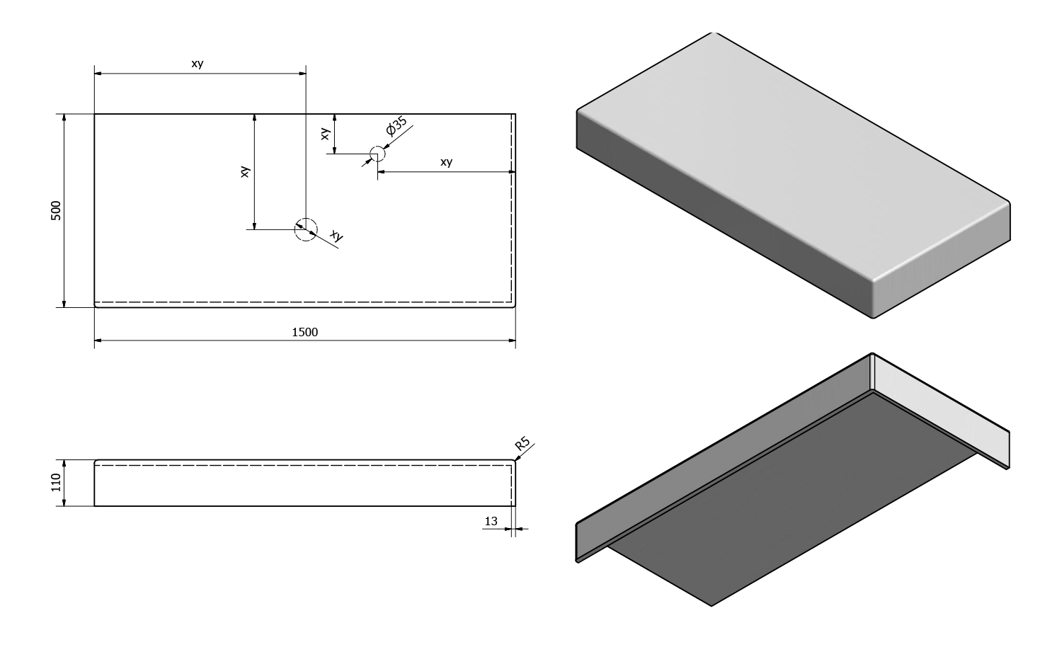 - Možnost dodání s otvory pro baterii a odpad dle výkresu (lze vrtat i v místě instalace)