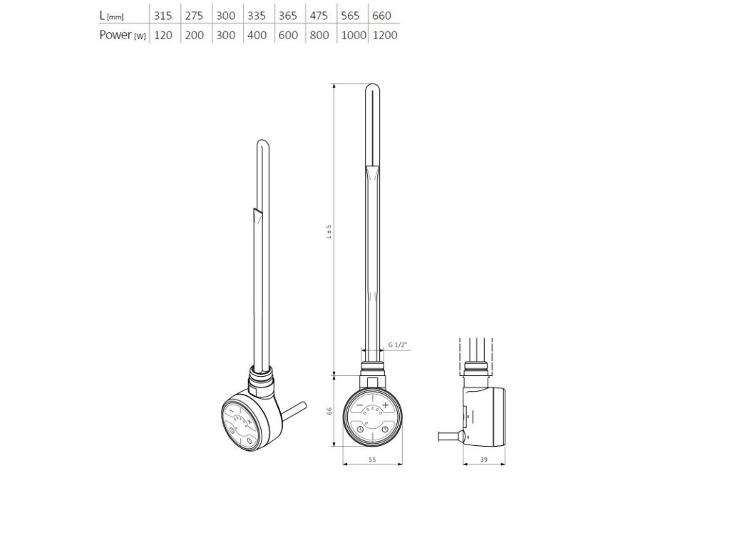 Regulátor MOA s minimalistickým designem a velkými tlačítky se jednoduše ovládá. Pomocí tlačítek můžete zapnout a vypnout nebo změnit teplotu topného prvku. MOA nabízí i možnost 2hodinového časovače, kdy jen stisknete tlačítko a regulátor se po 2 hodinách sám vypne. Tato funkce je užitečná, když chcete třeba jen vysušit ručníky. Elektrické topné těleso ohřívá a zároveň přesně kontroluje jeho teplotu. I. třída ochrany, stupeň krytí IPX5, provozní napětí 230V/50Hz, rozsah teplot 30-60 °C (s krokem 5 °C), připojovací závit G1/2" vnější (na topné tyči), výkon topné tyče 800 W. Pro detailnější informace a vlastnosti elektrického regulátoru Terma MOA klikněte ZDE.Additional parameters