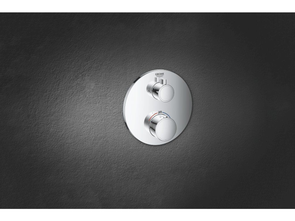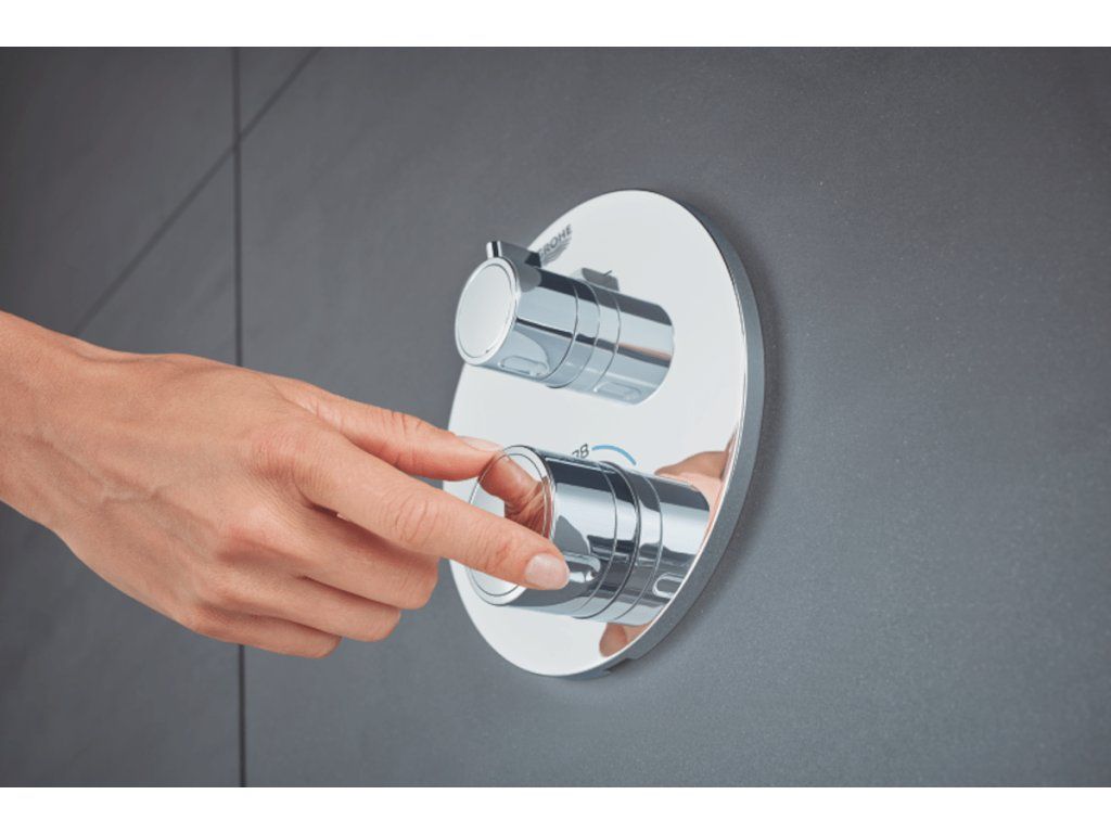 Termostatická sprchová baterie Grohtherm poslouží jako dokonalý finální prvek vašeho sprchového koutu. Umožňuje snadné přepínání mezi hlavovou a ruční sprchou a efektivní ovládání vody. Díky GROHE SafeStop, zabraňuje nechtěnému nastavení teploty vyšší než 38 °C. Tuto baterii je možné zapojit pouze v kombinaci s podomítkovým tělesem GROHE Rapido SmartBox (35600000).Doplňkové parametry