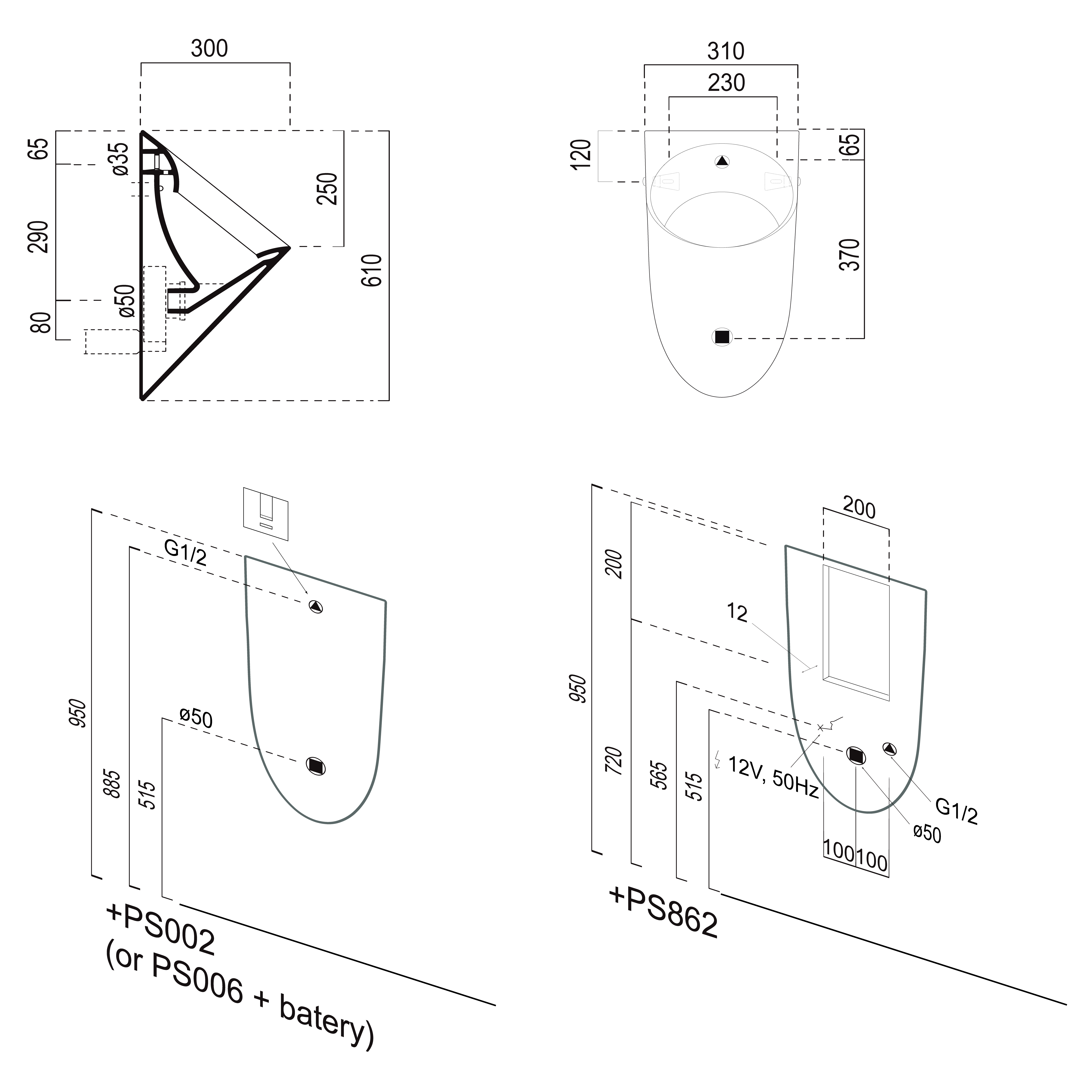 - Při instalaci s automatickým splachovačem PS002 je nutné instalovat i napájecí zdroj (PS05T nebo PS10T).