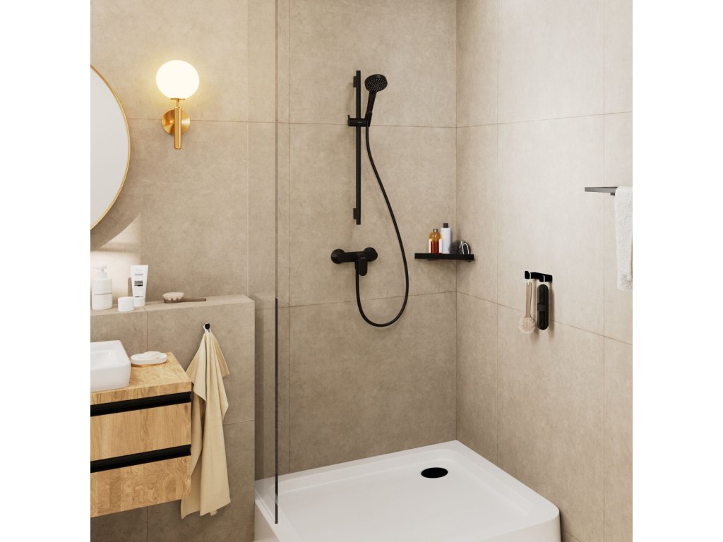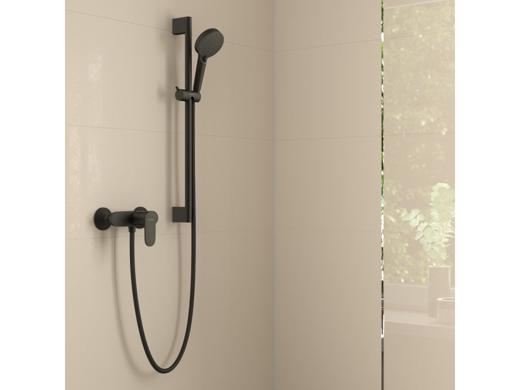 Páková nástěnná sprchová baterie se sprchovým setem v barvě černá matná. Průtok baterie je 9,7 litrů/minutu. Rozteč baterie 150 mm. S matným povrchem.Doplňkové parametry