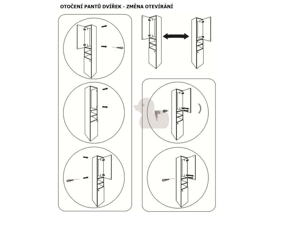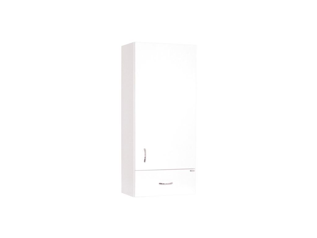 Závěsná skříňka do koupelny s dvířky. Skříňka má lakované boky i čela (bílý lesk). Dvířka se dají otočením změnit na levou či pravou variantu. Skříňka má 2 stavitelné poličky.Doplňkové parametry