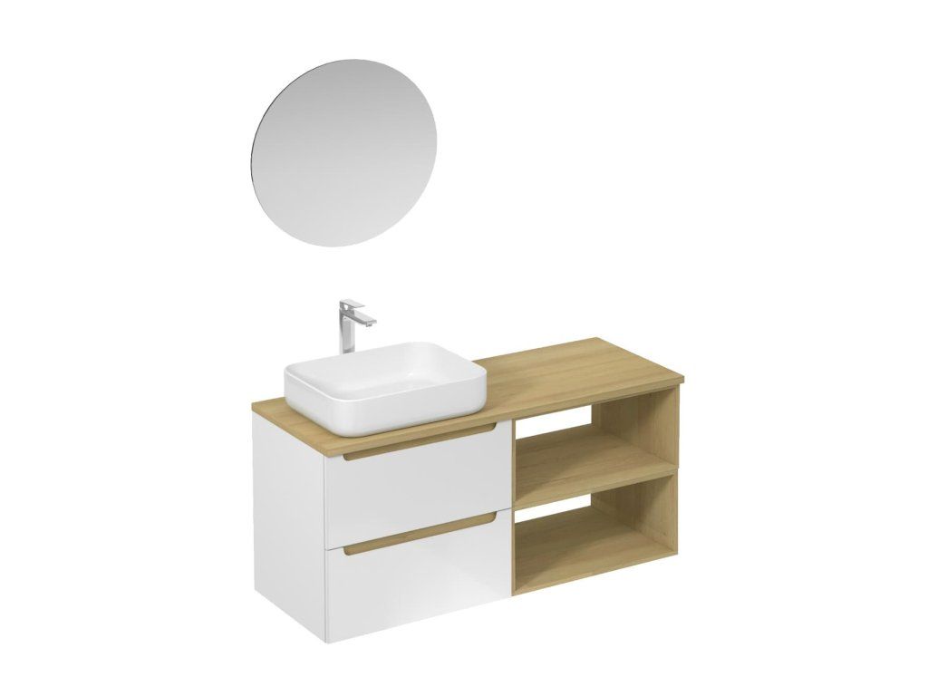 Závěsná koupelnová sestava s keramickým umyvadlem v bílé barvě s lesklým povrchem s fóliovaným povrchem. S plnovýsuvem a dotahem.Doplňkové parametry