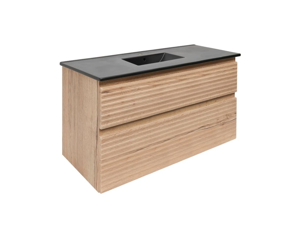 Závěsná koupelnová skříňka s keramickým umyvadlem v dekoru dub halifax s matným povrchem o rozměru 98x53x44,8 cm. Povrch v provedení lamino.Doplňkové parametry