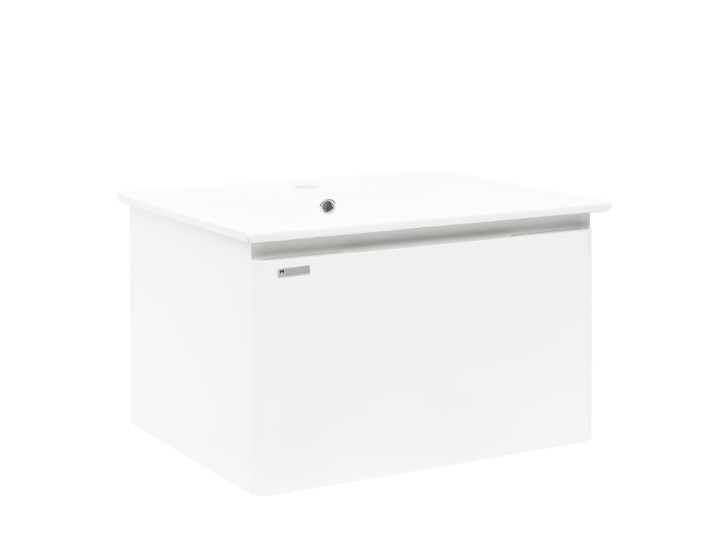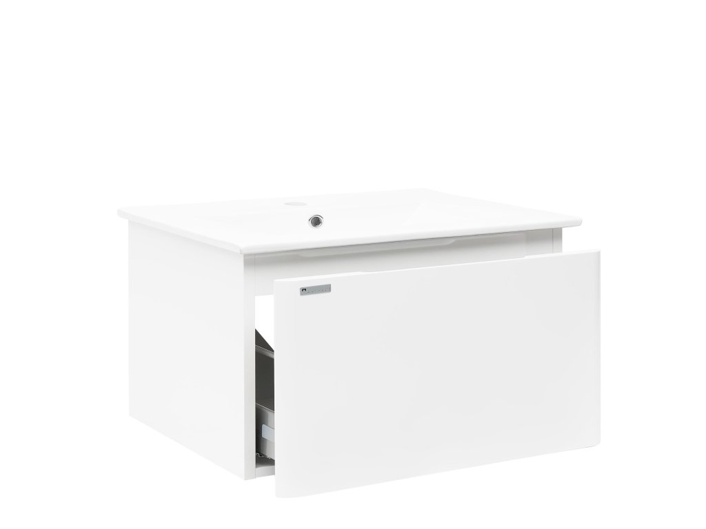 Závěsná koupelnová skříňka s keramickým umyvadlem v bílé barvě o rozměru 80x45x46 cm. Povrch v provedení fólie. S plnovýsuvem a dotahem.Doplňkové parametry