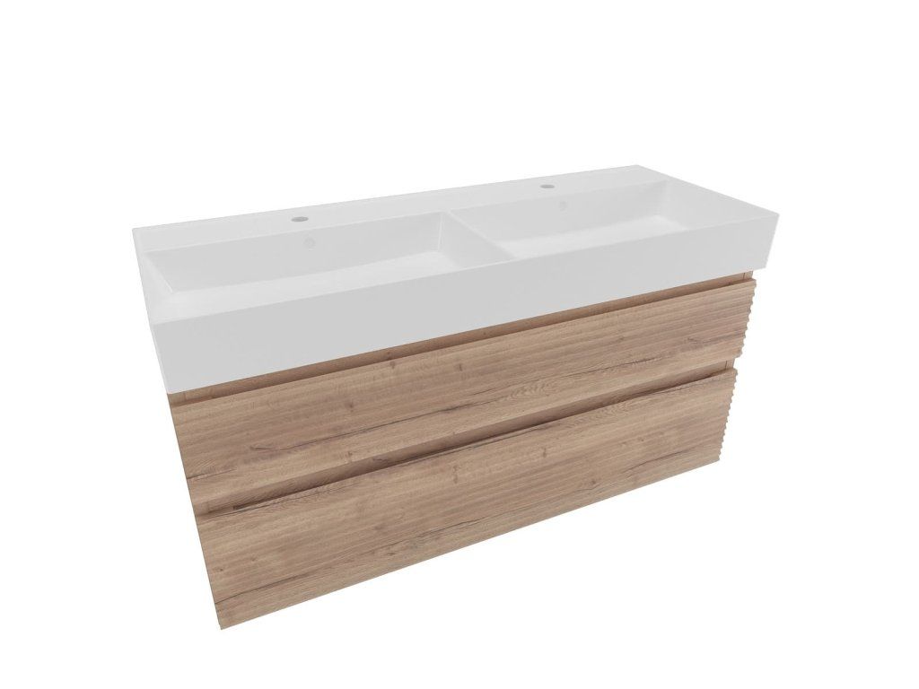Závěsná koupelnová skříňka s keramickým umyvadlem v dekoru dub halifax s matným povrchem o rozměru 118x53x44,8 cm. Povrch v provedení lamino.Doplňkové parametry
