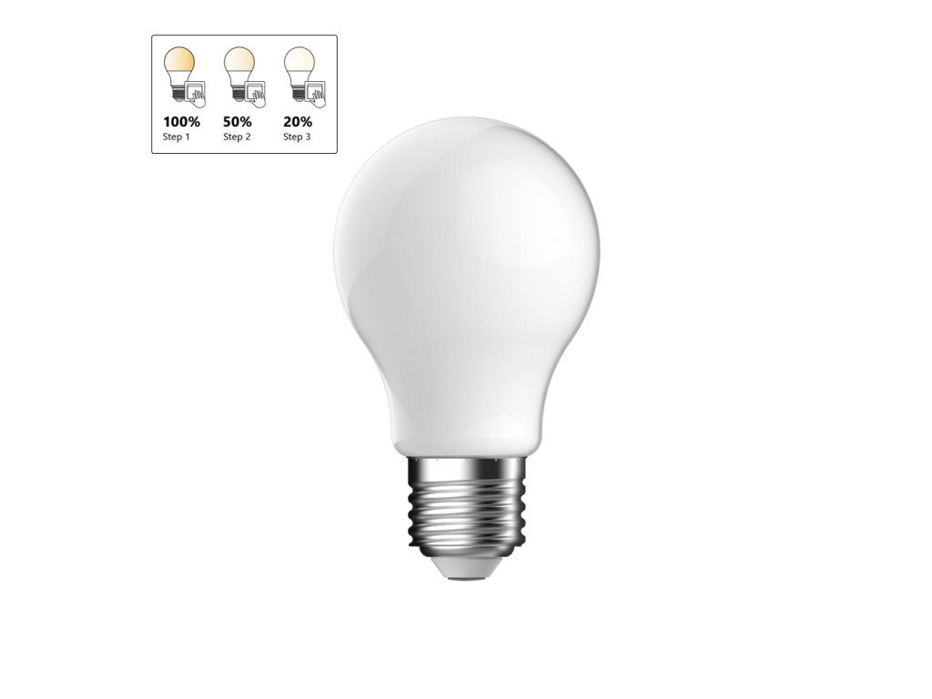 LED žárovka E27 Žárovka A60 s paticí E27 a teplým bílým světlem. Vestavěné stupňovité stmívání umožňuje nastavit jas ve třech krocích – 100 %, 50 % nebo 20 % – pomocí vypínače. Funkce paměti světlo znovu rozsvítí na poslední nastavení.Doplňkové parametry