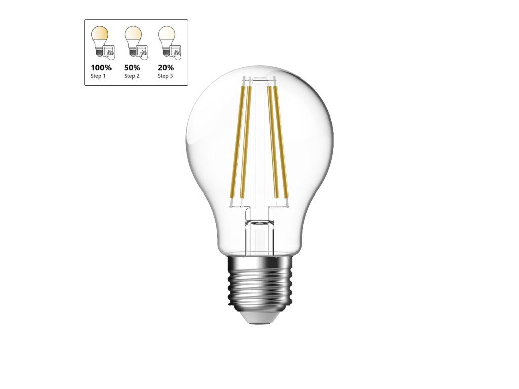 LED žárovka E27 Žárovka A60 s paticí E27 a teplým bílým světlem. Vestavěné stupňovité stmívání umožňuje nastavit jas ve třech krocích – 100 %, 50 % nebo 20 % – pomocí vypínače. Funkce paměti světlo znovu rozsvítí na poslední nastavení.Doplňkové parametry