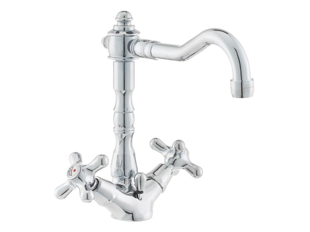 Kohoutková stojánková umyvadlová baterie s výpustí. V retro designu. V chromovém provedení. Výška baterie je 16,2 cm.