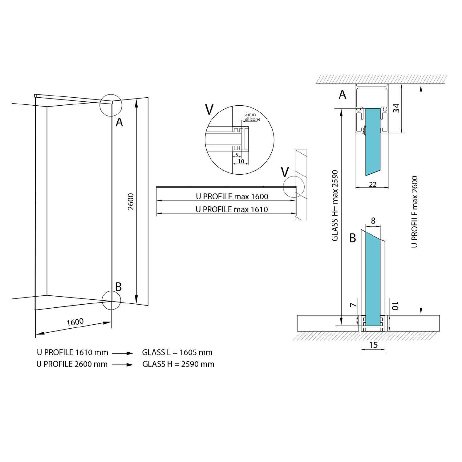 Sada profilů pro uchycení skla rozměrů: