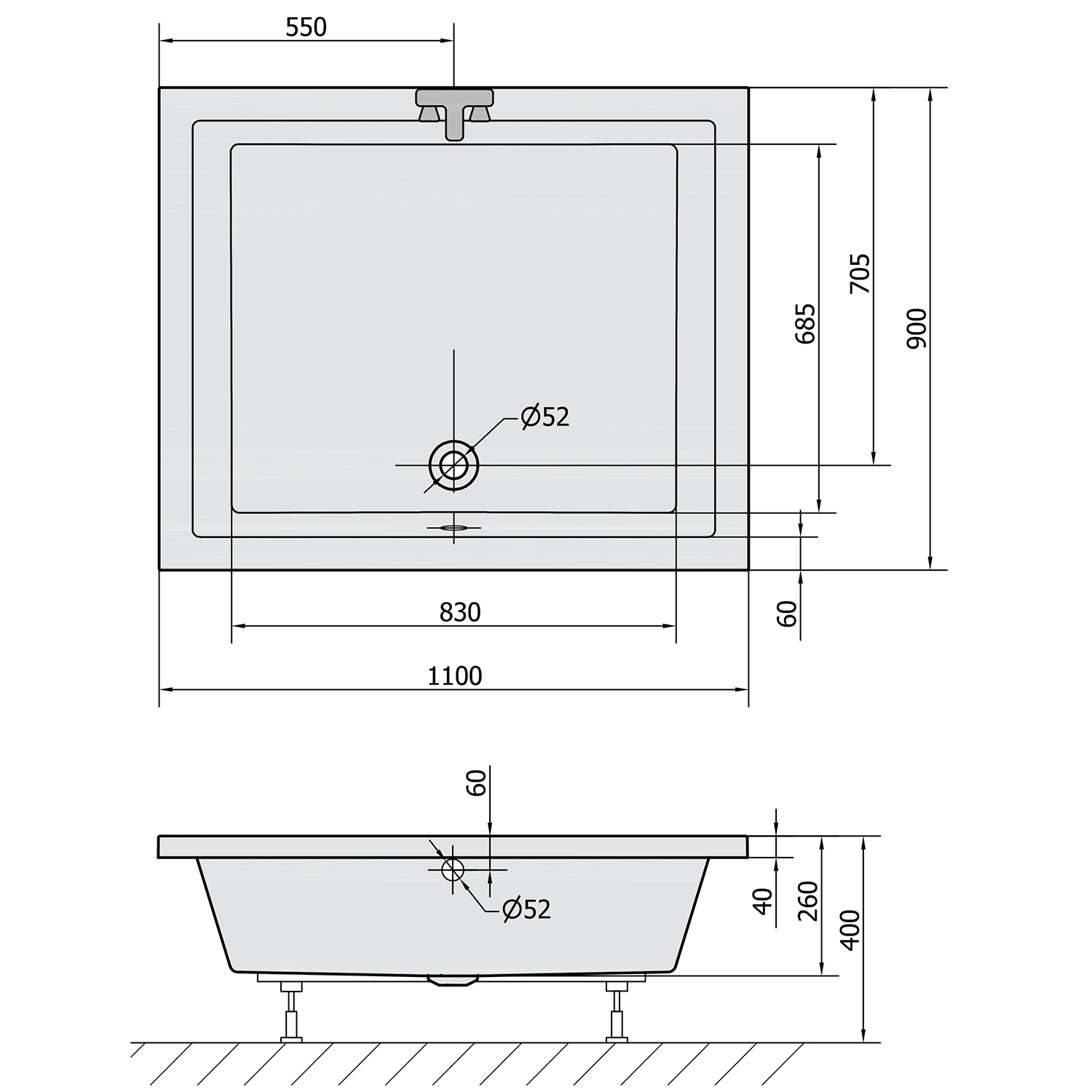 - Vaničku lze usadit na nožičky nebo nosnou konstrukci, vhodné typy jsou uvedeny u každé vaničky