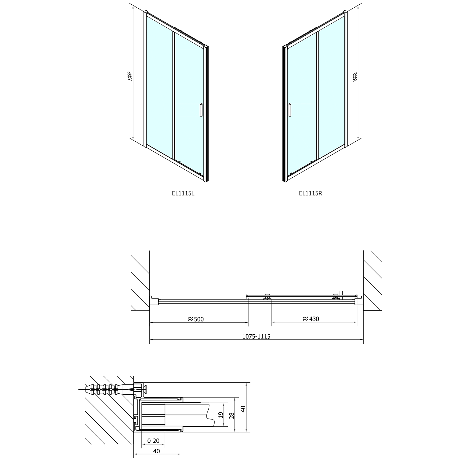- Instalační rozměr dveří do niky lze díky rozšiřovacímu profilu EL825 zvětšit o 25 mm na každou stranu, celkem o 50 mm