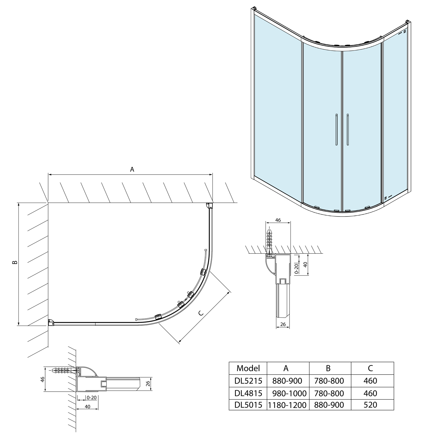 - Snadnou montáž umožňuje výsuvný stěnový profil v rozmezí 0-20 mm