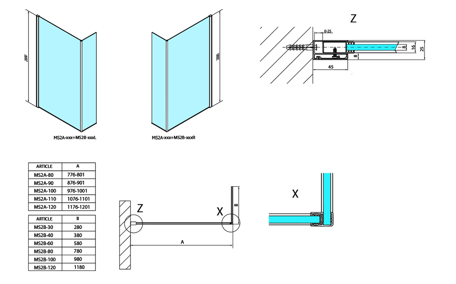 Aby vznikla dvoudílná zástěna ve tvaru "L", je potřeba k pevné stěně dokoupit přídavný pevný panel MS2B.