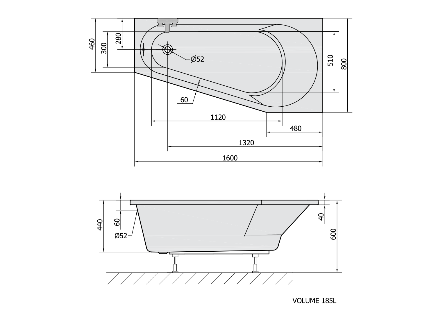 Polysan PROJEKTA R asymetrická vana 160x80x44cm, bílá 21111