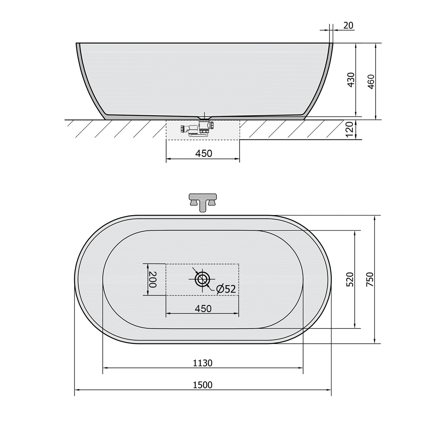 Polysan REDUTA volně stojící vana litý mramor 150x75x46cm, černá/bílá 72974
