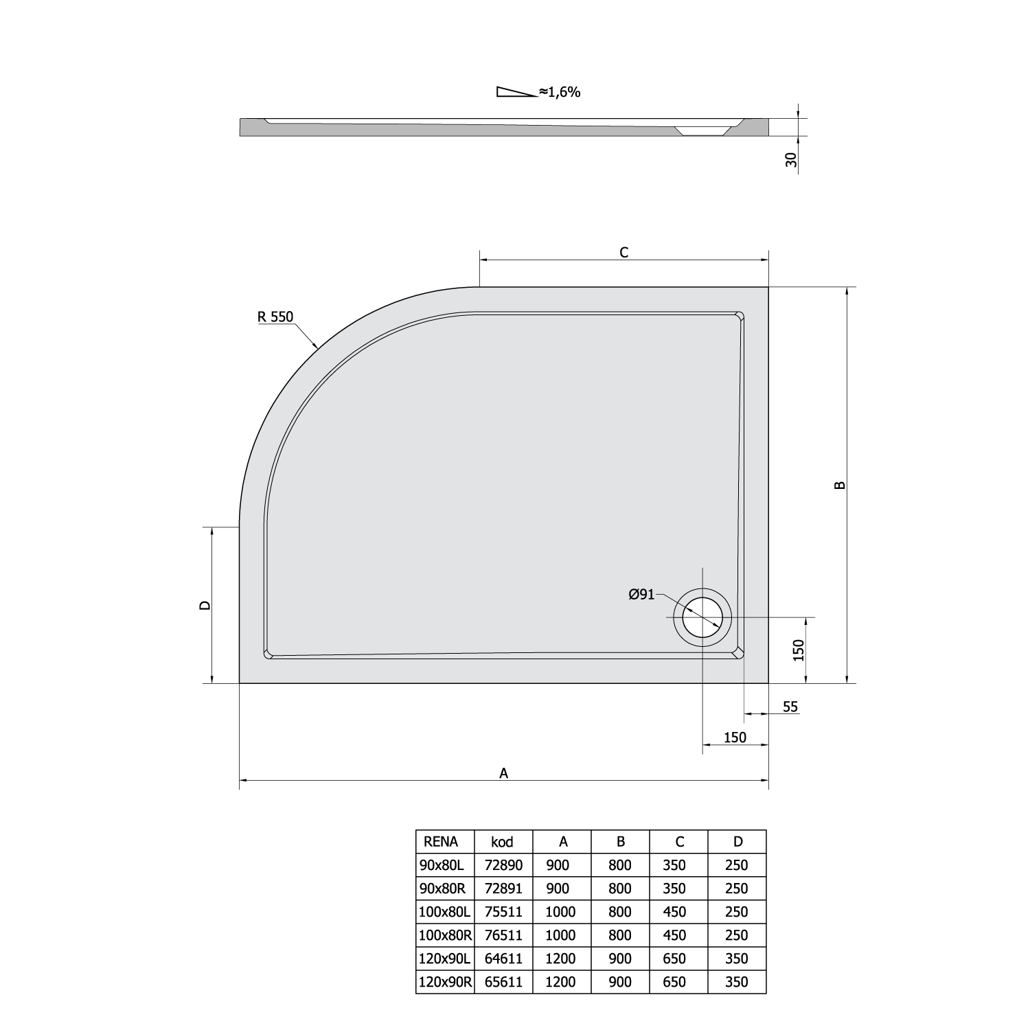 Polysan RENA L sprchová vanička z litého mramoru, čtvrtkruh 100x80cm, R550, levá, bílá 75511