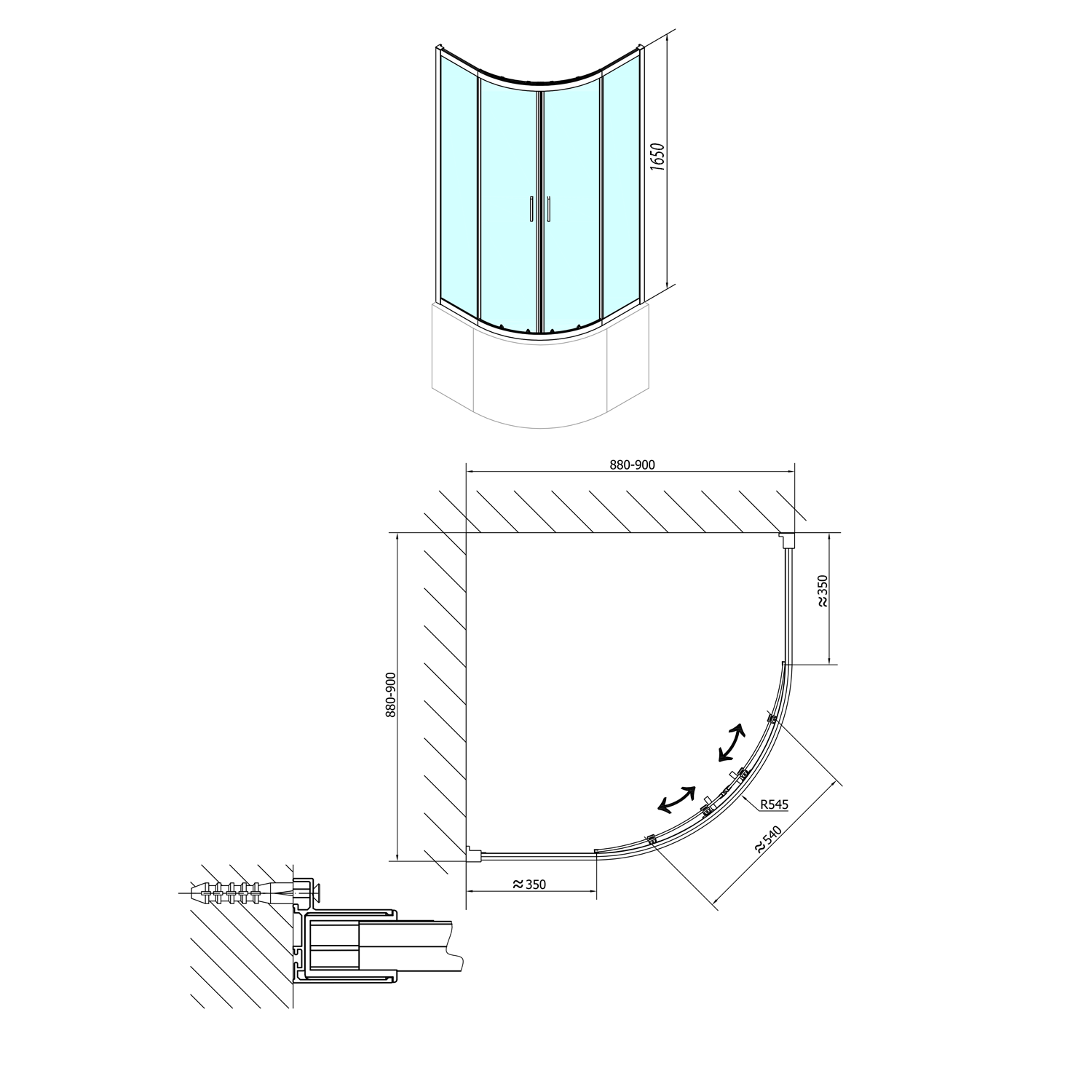 - Čtvrtkruhová zástěna s dvoudílnými posuvnými dveřmi