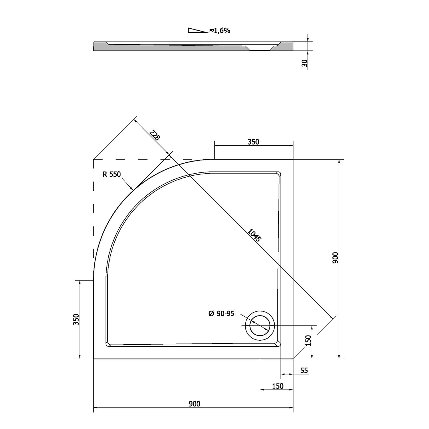 Polysan SERA sprchová vanička z litého mramoru, čtvrtkruh 90x90cm, R550, bílá 41511