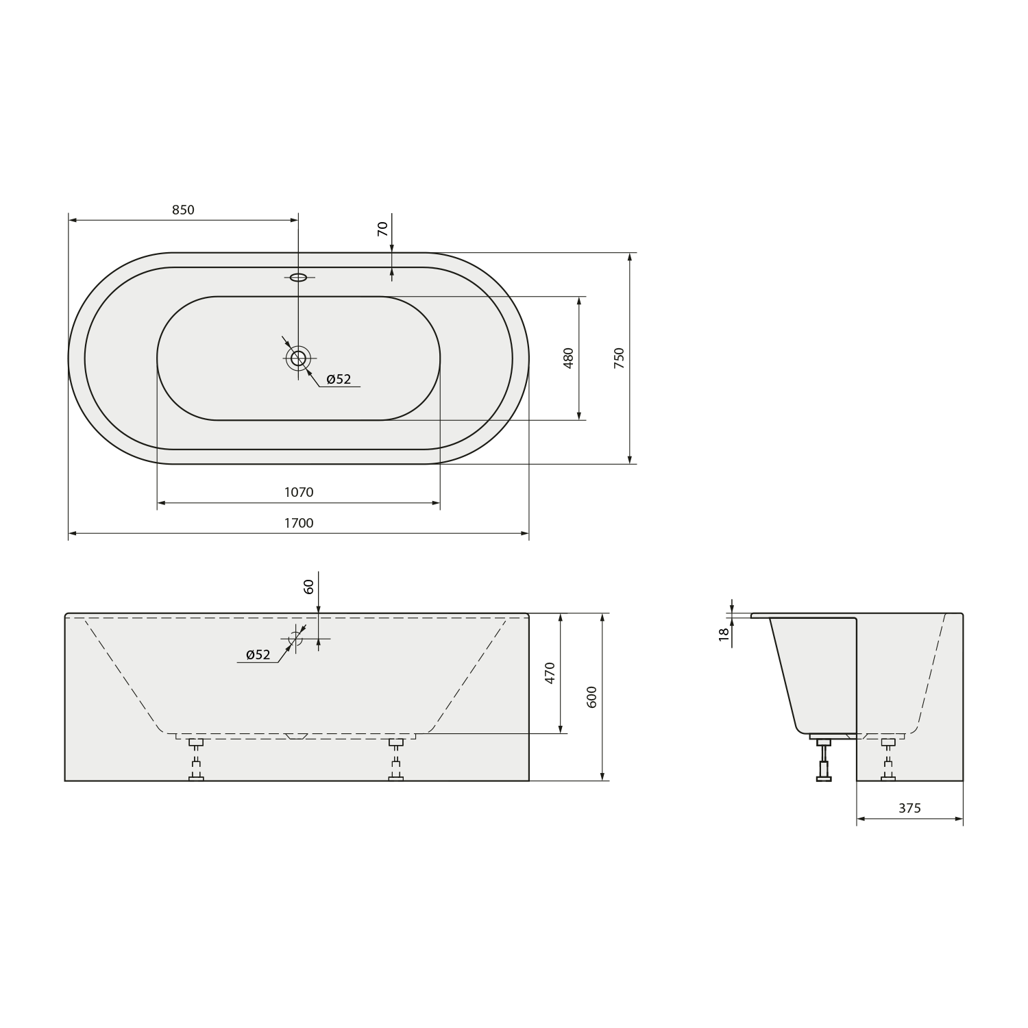 Polysan VIVA C MONOLITH oválná polozápustná vana 170x75x60cm, bílá 79119CM