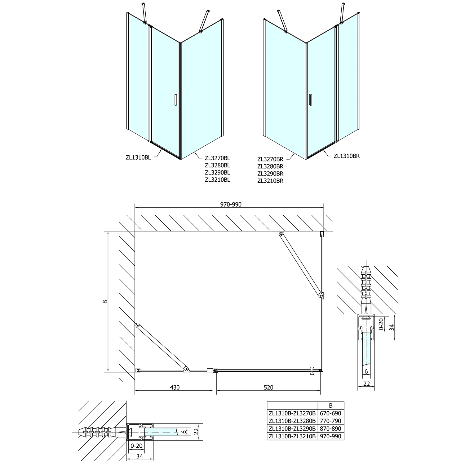 - Skládací dveře 700 až 900 mm v provedení levá a pravá lze instalovat do niky nebo v kombinaci L/R vytvořit čtvercovou nebo obdélníkovou zástěnu s rohovým vstupem