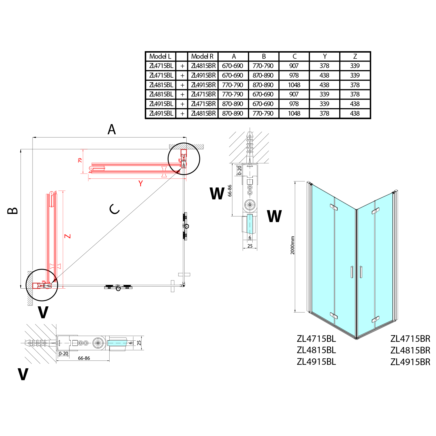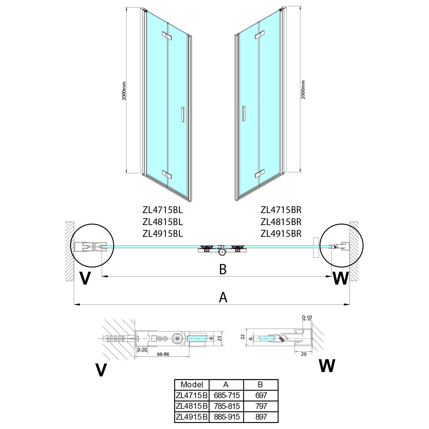 - Skládací dveře 700 až 900 mm v provedení levá a pravá lze instalovat do niky nebo v kombinaci L/R vytvořit čtvercovou nebo obdélníkovou zástěnu s rohovým vstupem