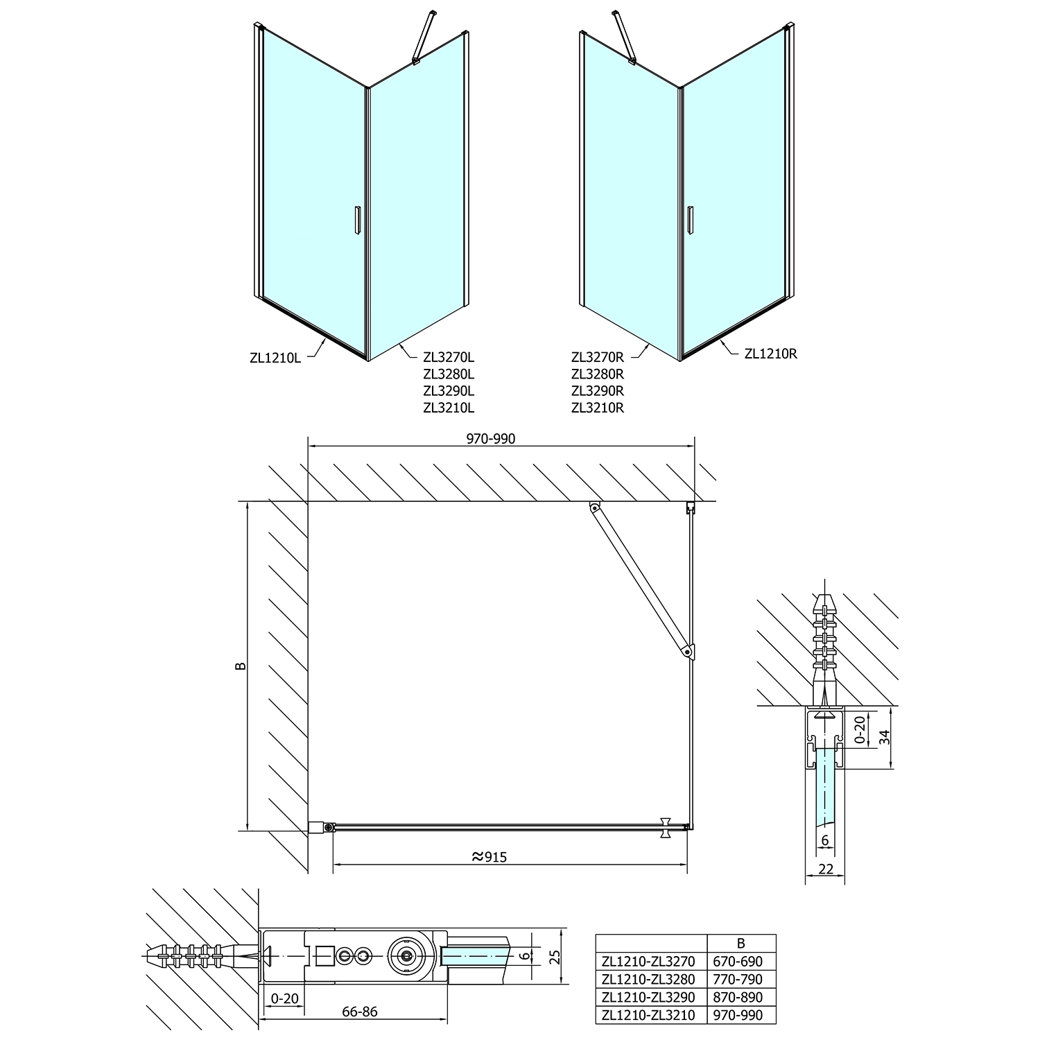 - Skládací dveře 700 až 900 mm v provedení levá a pravá lze instalovat do niky nebo v kombinaci L/R vytvořit čtvercovou nebo obdélníkovou zástěnu s rohovým vstupem
