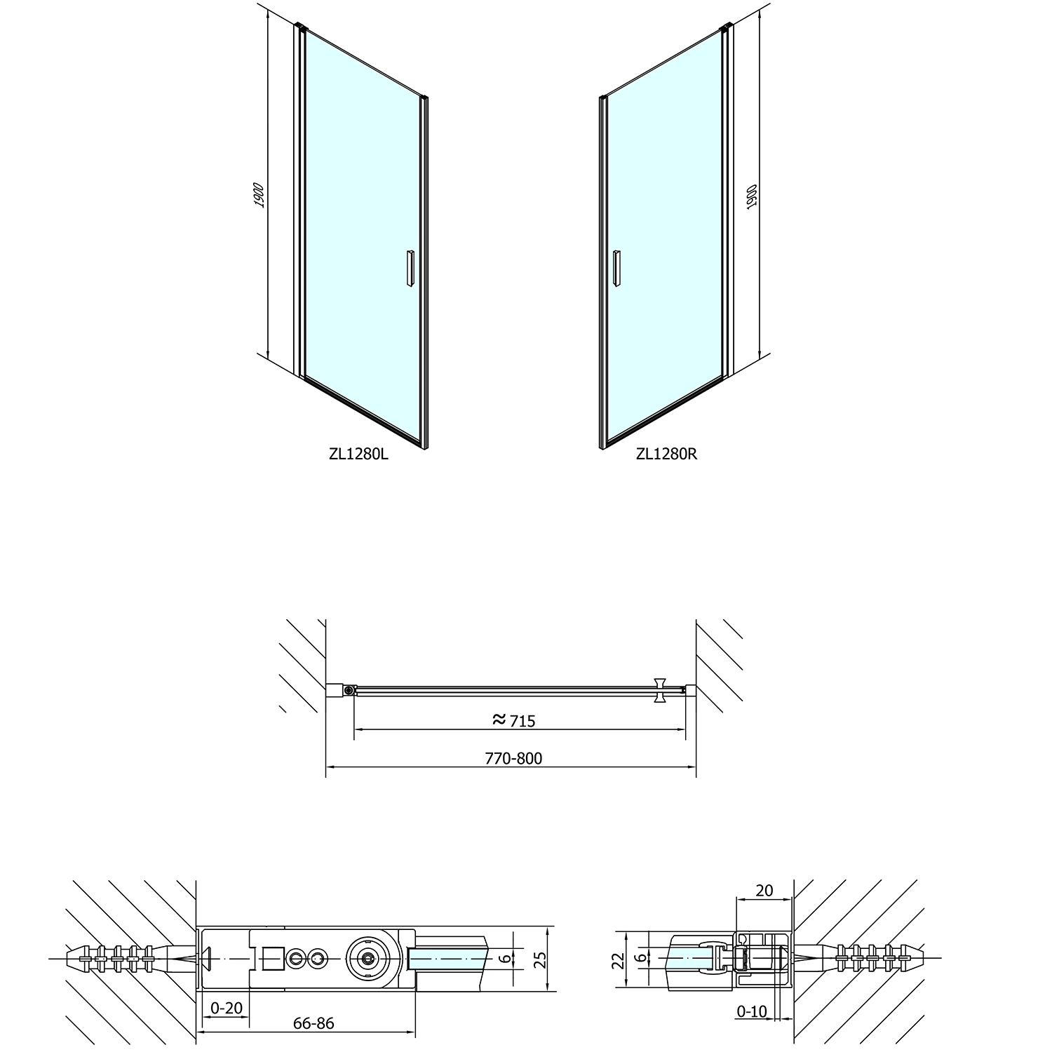 - Skládací dveře 700 až 900 mm v provedení levá a pravá lze instalovat do niky nebo v kombinaci L/R vytvořit čtvercovou nebo obdélníkovou zástěnu s rohovým vstupem