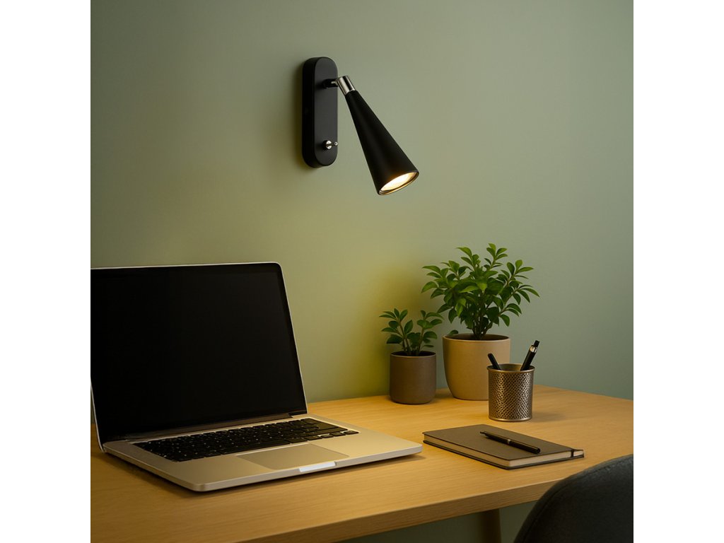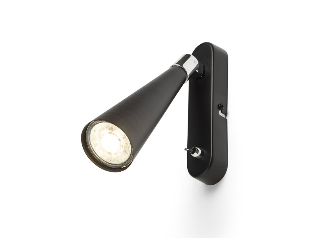 Nástěnné svítidlo s kónickým reflektorem pro LED žárovku s paticí GU10, páčkový vypínač je umístěný na základně.Doplňkové parametry