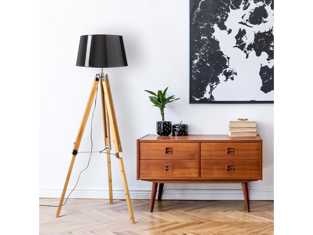 Stojanová lampa se stínidlem z lesklé černé folie se zlatou vnitřní stranou. Výškově nastavitelný bambusový podstavec. Vhodné pro LED světelné zdroje se závitem E27.Doplňkové parametry