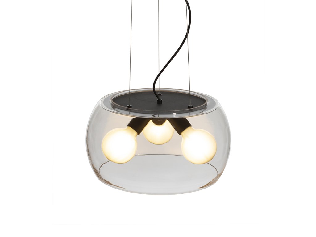 Závěsné skleněné svítidlo ve více barevných variantách skla pro tři LED žárovky s paticí E27. Černě lakovaná závěsná sada s nerezovými lanky a PVC kabelem. Drobné bublinky ve skle jsou způsobeny výrobním procesem, nejedná se o vadu stínidla.Doplňkové parametry