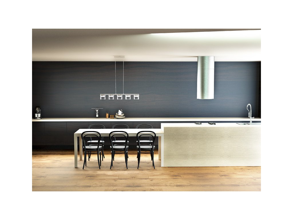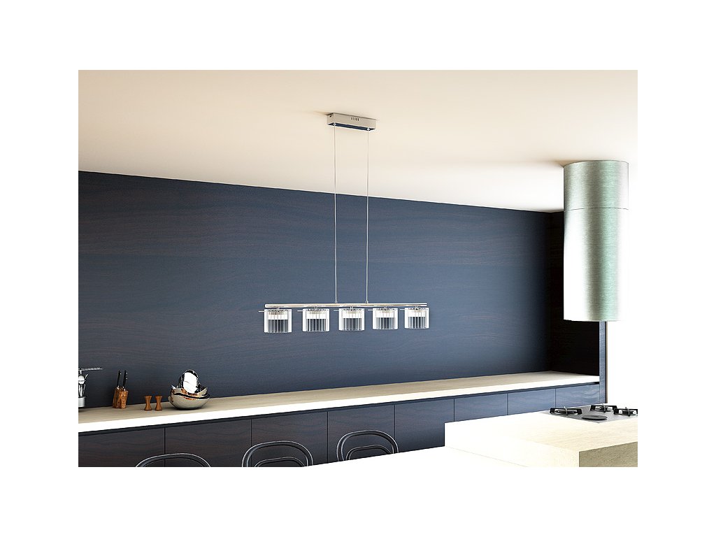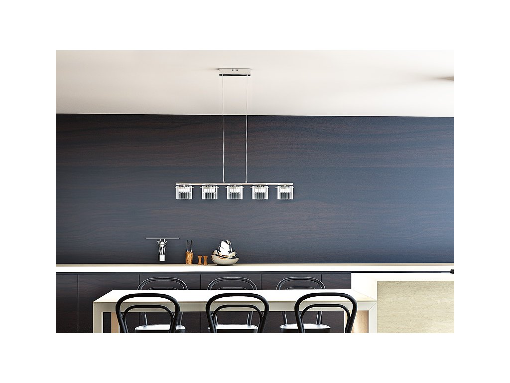 Závěsné lineární LED svítidlo s 5 ozubenými hliníkovými reflektory krytými čirým skleněným stínidlem.Doplňkové parametry