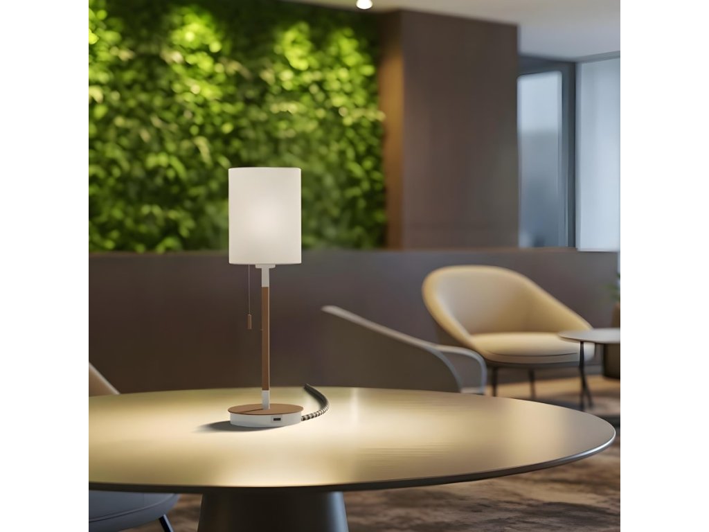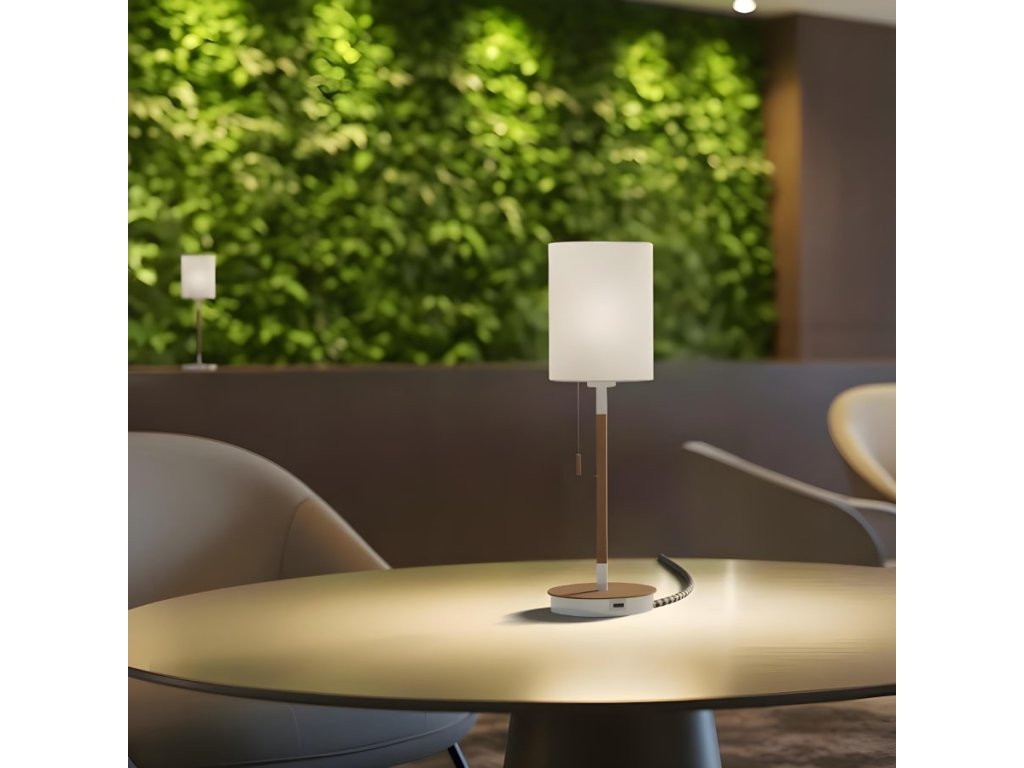 Stolní lampa s textilním stínidlem a USB portem zabudovaným v podstavci. Podstavec je v imitaci buku s bíle lakovanými detaily. Vhodné pro LED světelné zdroje se závitem E27.Doplňkové parametry