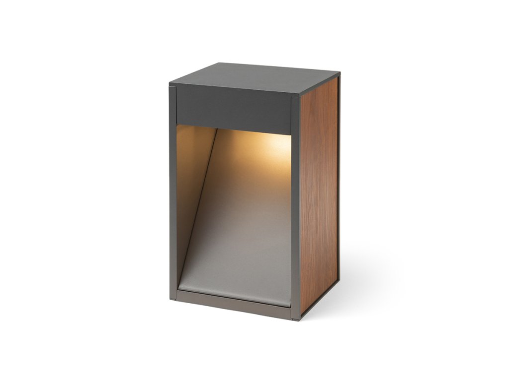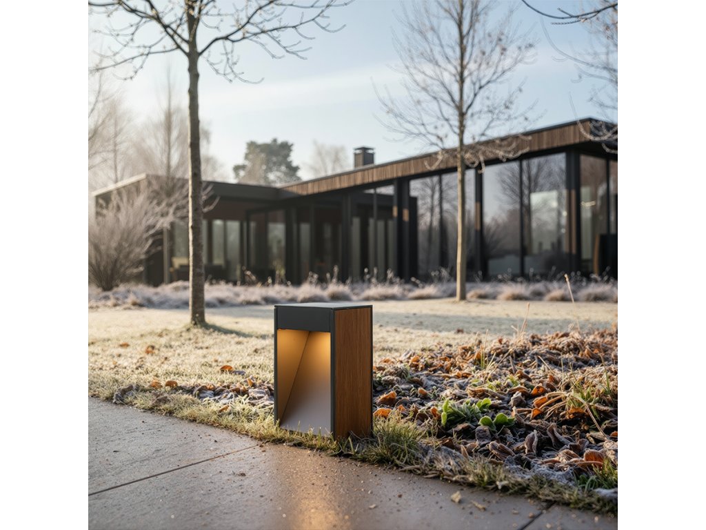 Masivní venkovní stojanová lampa s dekorem dřeva po stranách svítidla. Svítidlo je pro lineární LED zdroje s paticí R7s 78mm do průměru 20mm.Doplňkové parametry