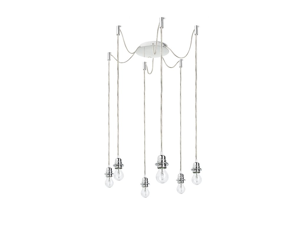 Závěsné svítidlo s centrální stropní základnou a šesti jednotlivými textilními závěsy s kovovou paticí E27, pro použití s dekorativními žárovkami nebo vhodnými textilními stínidly. Závěsy jsou opatřeny stropními chromovými úchyty, které lze umístit do individuálně zvolné vzdálenosti od základny. Celková délka kabelu 3 m.Doplňkové parametry