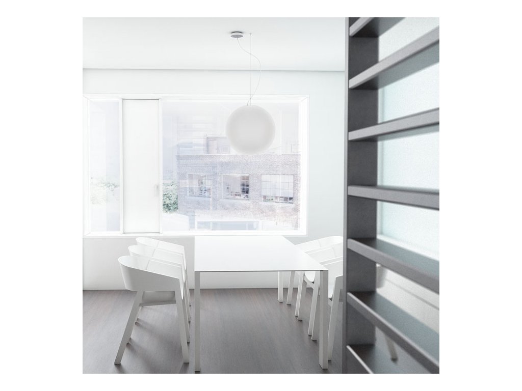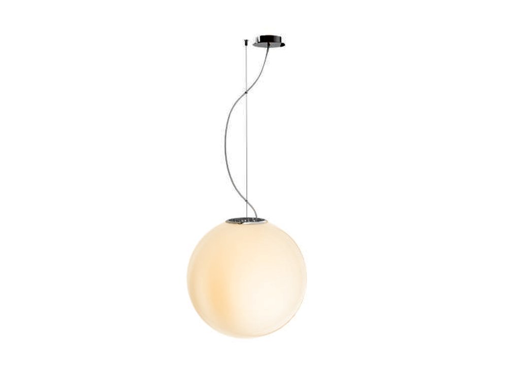 Závěsné svítidlo se stínidlem z triplex opálového matného skla, excentricky zavěšeným na lanku pro montáž mimo elektrický přívod. Transparentní kabel, chromové doplňky.Doplňkové parametry