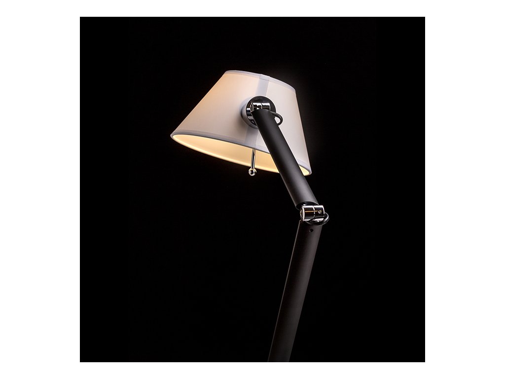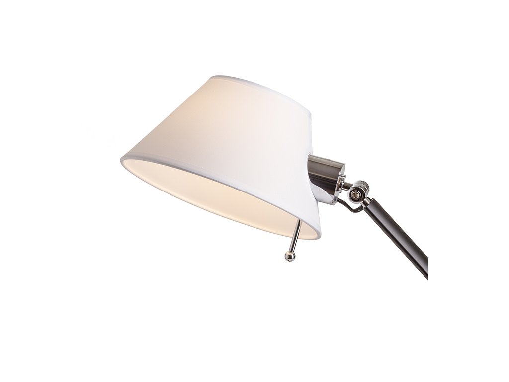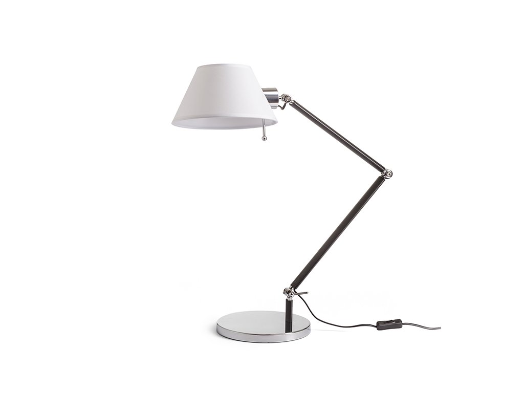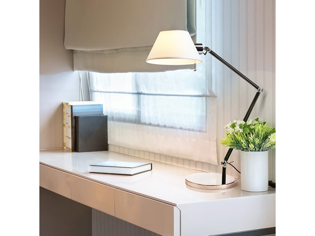 Stolní dvouramenná kovová lampička s textilním stínidlem.Doplňkové parametry