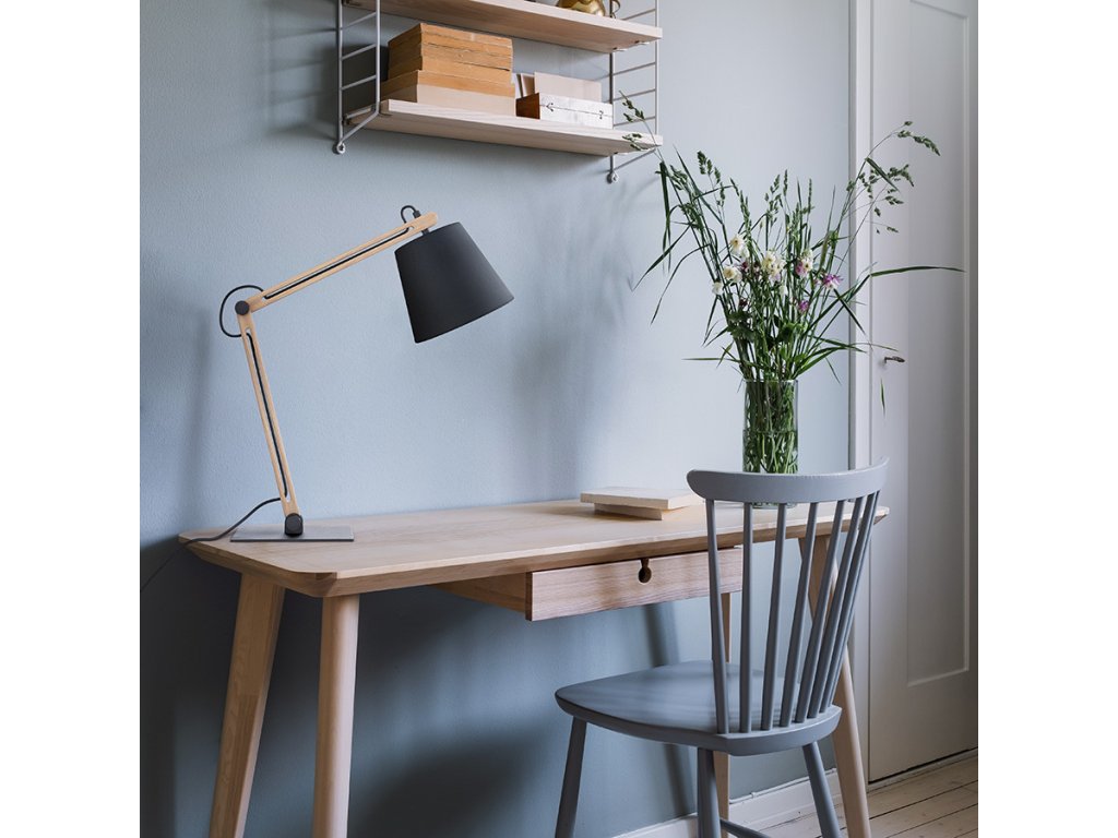 Stolní lampa s dřevěným nastavitelným ramenem a lakovanou kovovou základnou včetně textilního stínidla. Textilní přívodní kabel v černé barvě.Doplňkové parametry