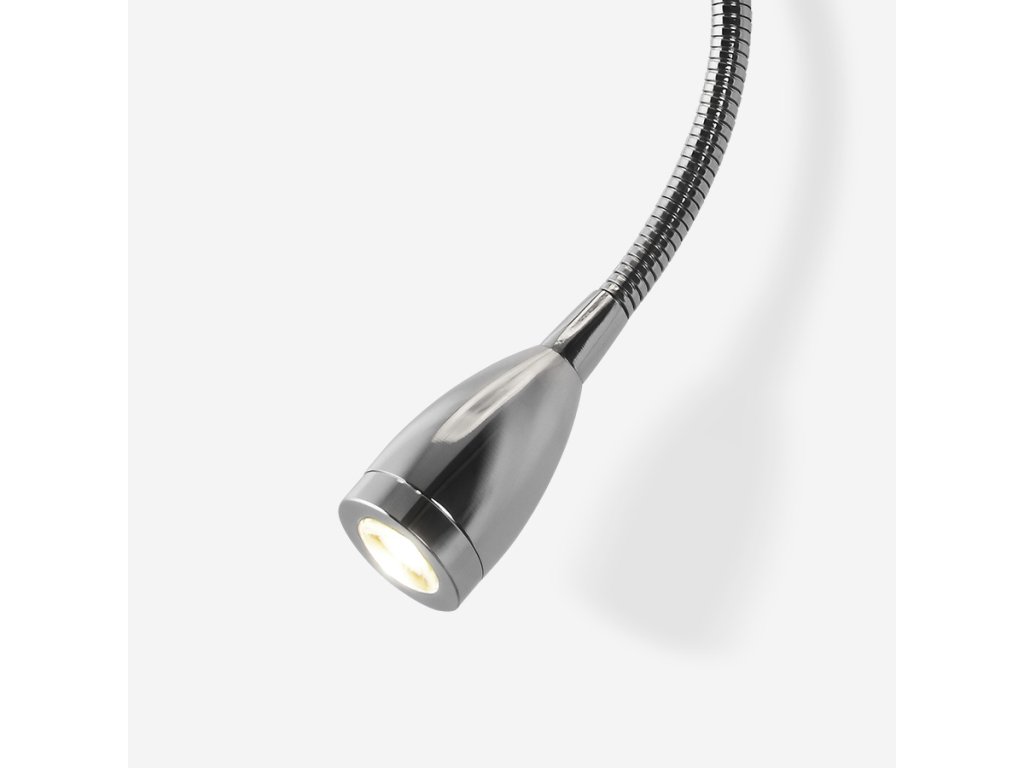 Nástěnné svítidlo s hranatým textilním stínidlem doplněné o ohebné rameno s LED diodovým reflektorem. Svítidlo má dva světelné zdroje, které lze ovládat samostatně otočným vypínačem umístěným na hranaté základně svítidla.Doplňkové parametry