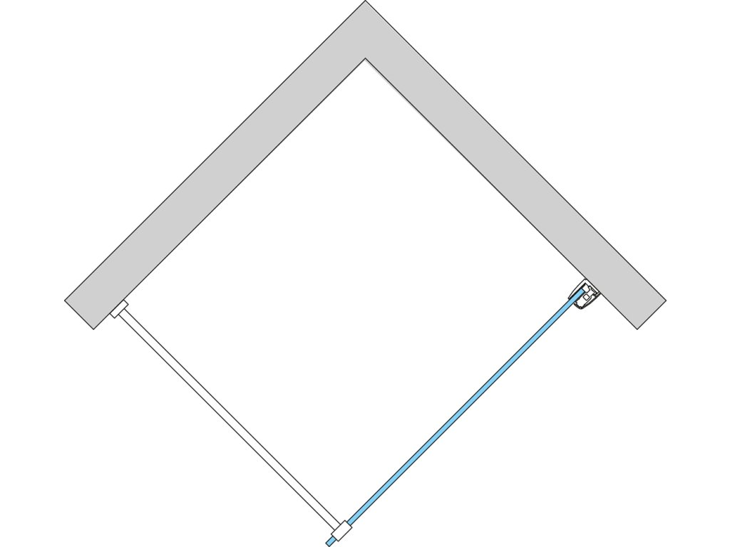 Montážní set s krátkou otočnou stěnou v 90° ze 6mm bezpečnostního skla. Kotvicí a spojovací profil + krátká otočná stěna o šířce 421 mm. Délka vodorovné/stropní vzpěry 1500 mm. Maximální výška pro kotvení je 3000 mm. Sklo 20 - Parsol šedá. Krátká otočná stěna částečně zamezí stříkání vody ze sprchovacího prostoru.Doplňkové parametry