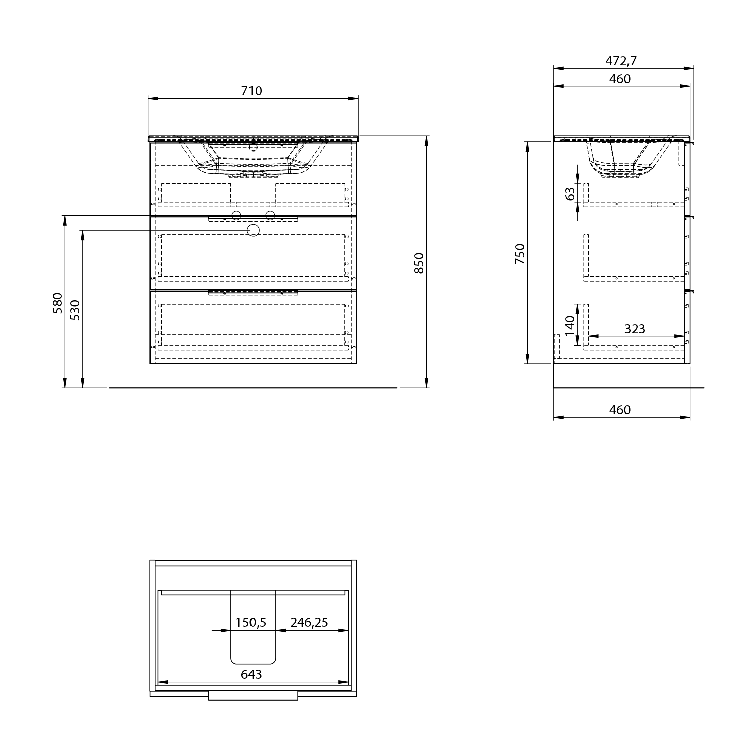 Sapho CIRASA umyvadlová skříňka 69,8x75x46cm, 3x zásuvka, bílá lesk CR731-3030