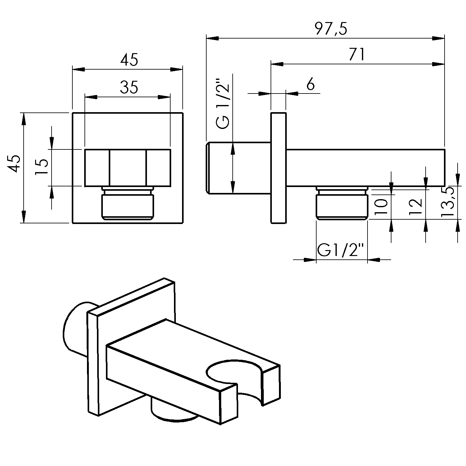Sapho Držák sprchy hranatý, pevný, s vyústěním, chrom AQ591